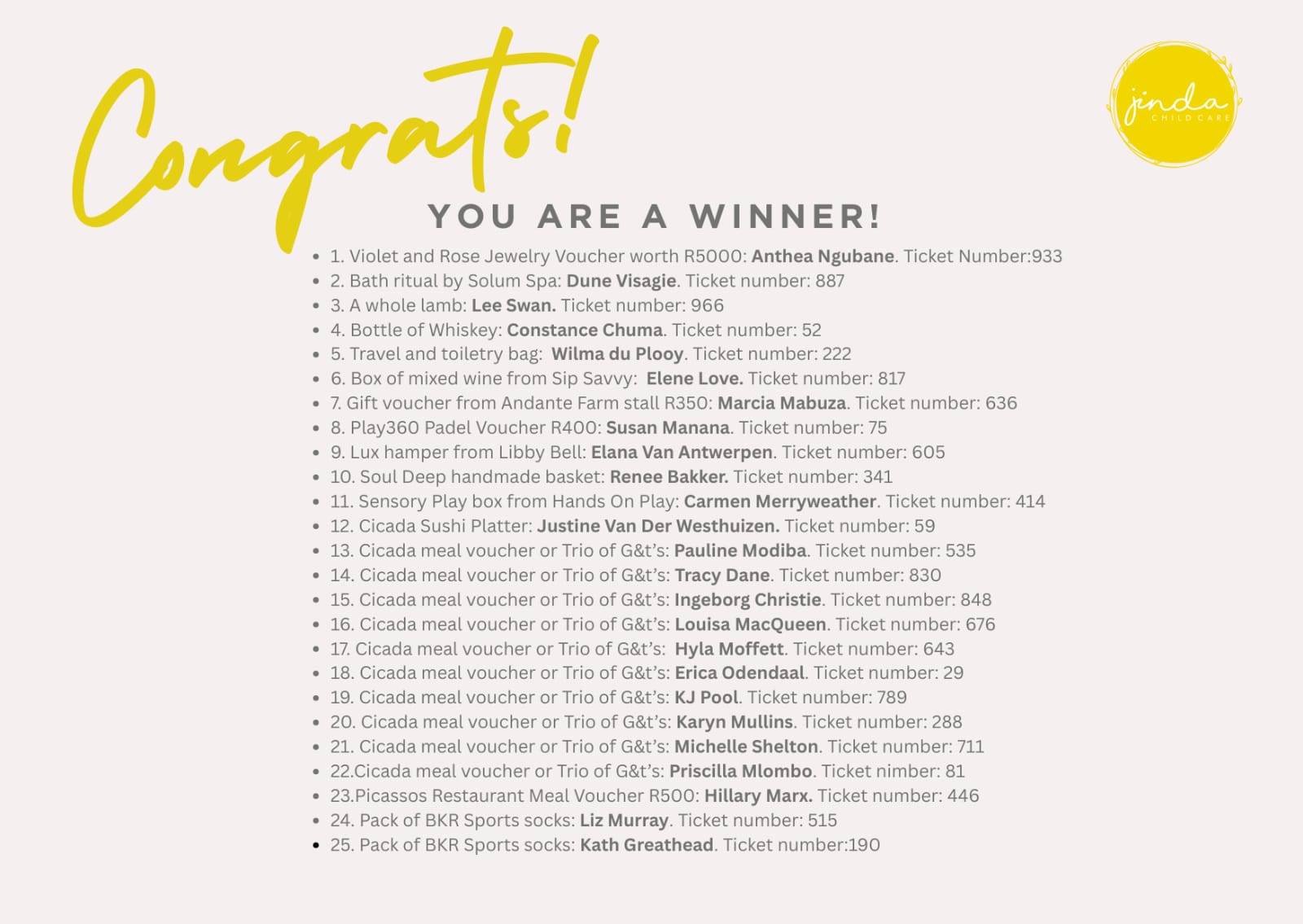 Jinda Child and Youth Care Centre is excited to launch our latest Raffle Ticket Fundraiser-an amazing opportunity to support local youth programs while getting the chance to win some fantastic prizes! Every ticket you purchase helps fund our organisations programs that empower our young people to grow, thrive, and succeed. Whether you’re a long-time supporter or joining us for the first time, your contribution makes a real impact. Tickets are just R20 and the draw will take place on 30th September.